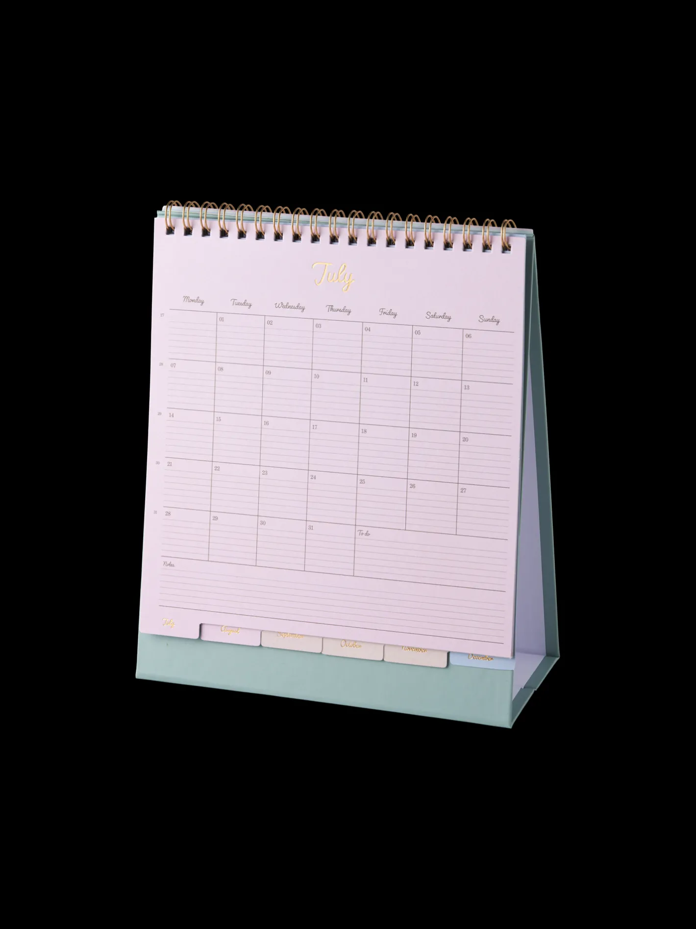 Søstrenes kalender med spiralryg har 12 sider, én for hver måned, og et nyttigt indeksark. Den har en fast bund, så den kan placeres på et skrivebord eller en anden flad overflade.