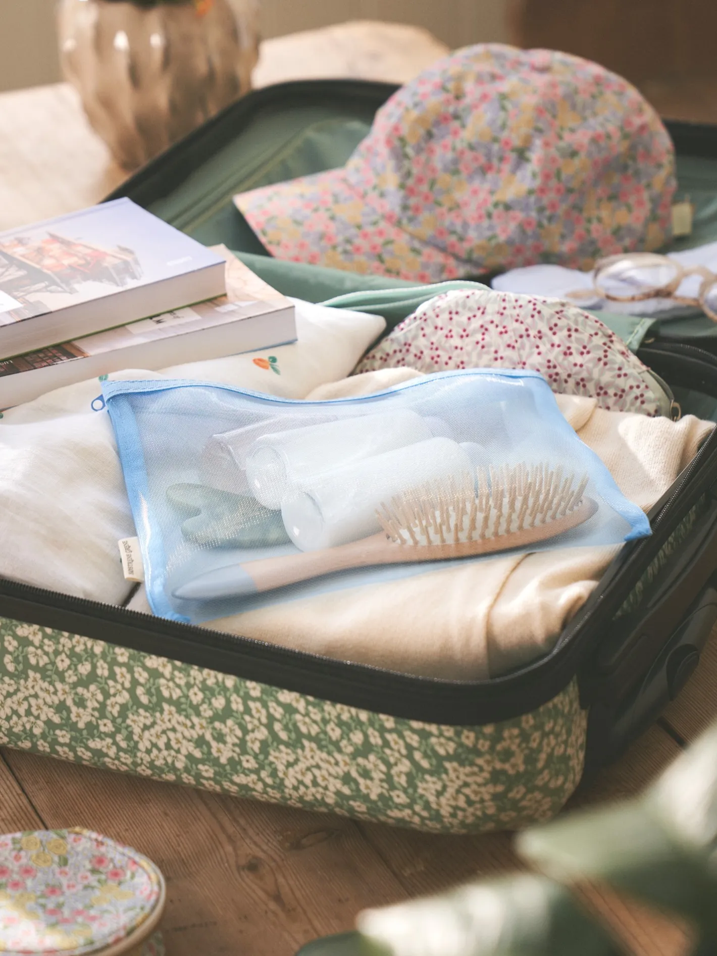 Søstrenes pung er lavet af nylon og måler 24 x 19 cm. Ideel til skriveredskaber eller til at medbringe alverdens ting og sager på Deres rejser.