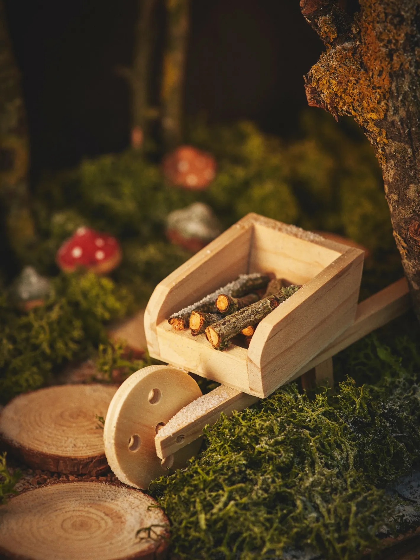 Søstrenes minitrillebør med træ er fremstillet af 100% FSC®-certificeret fyrretræ og krydsfiner. Trillebøren leveres med 4 små træskiver.Det er en herlig tilføjelse til Deres miniature julelandsby eller det lille julenissehus.