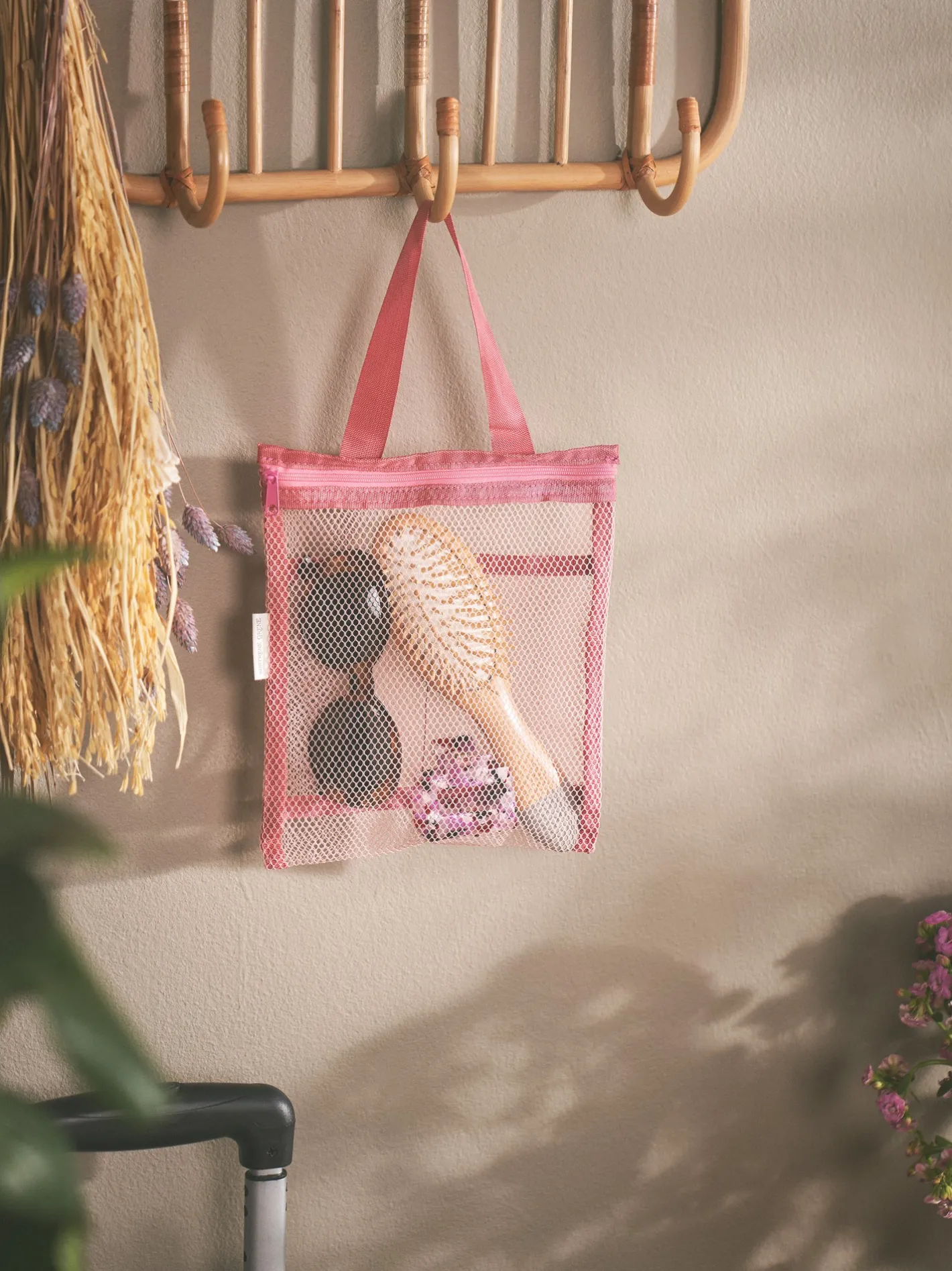 Søstrenes mesh-taske er en praktisk tilføjelse til Deres rejseudstyr og Deres hjem. Den har et håndtag så den kan hænges op og bruges som en lille vasketøjspose eller til opbevaring af småting.