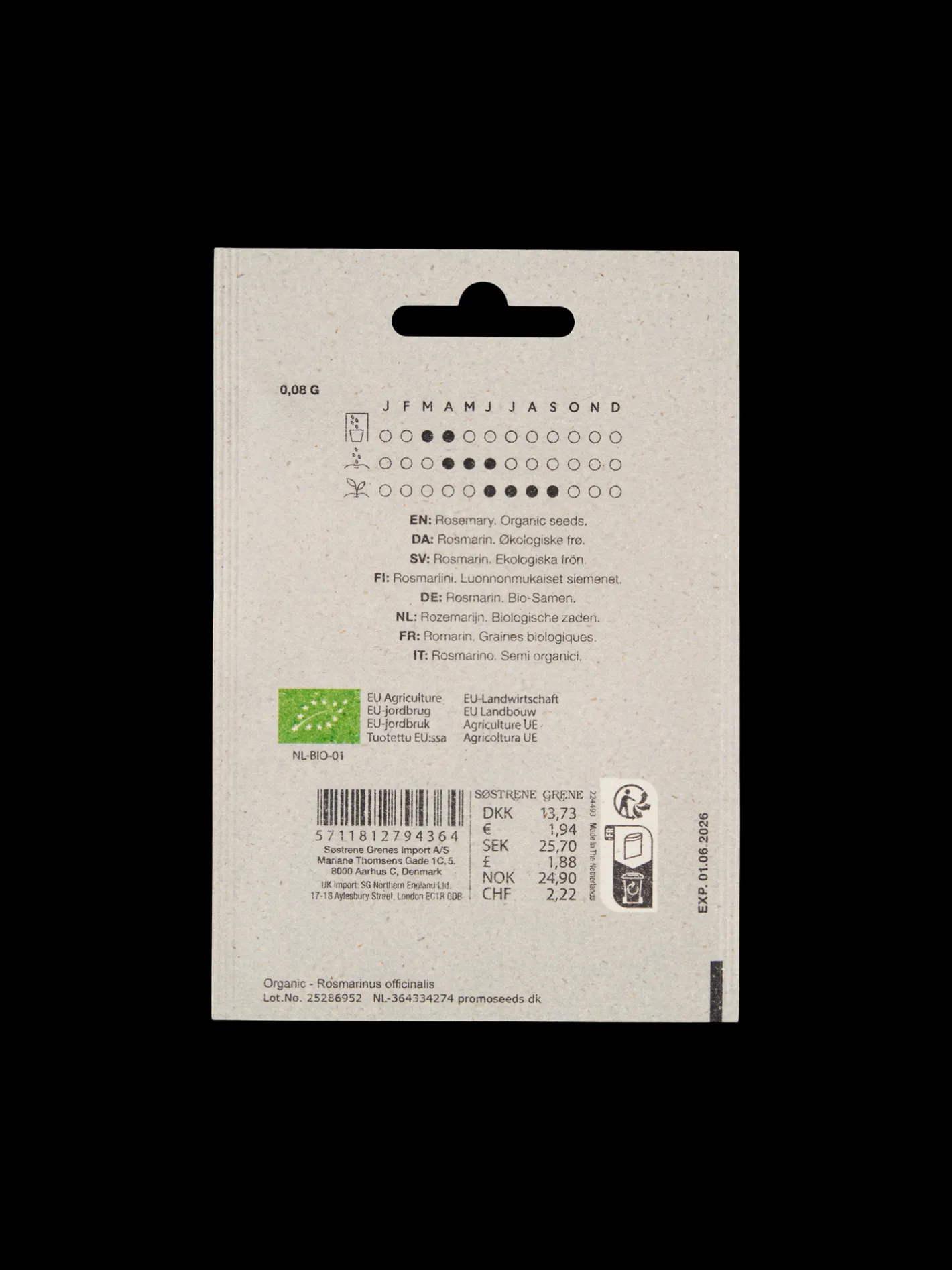 Søstrenes rosmarinfrø er økologiske. Der er 0,08 g i en pakke.Så frøene indendørs i en potte fra marts til april, eller så dem udendørs fra april til juni. Frøene kan eventuelt udplantes fra april.