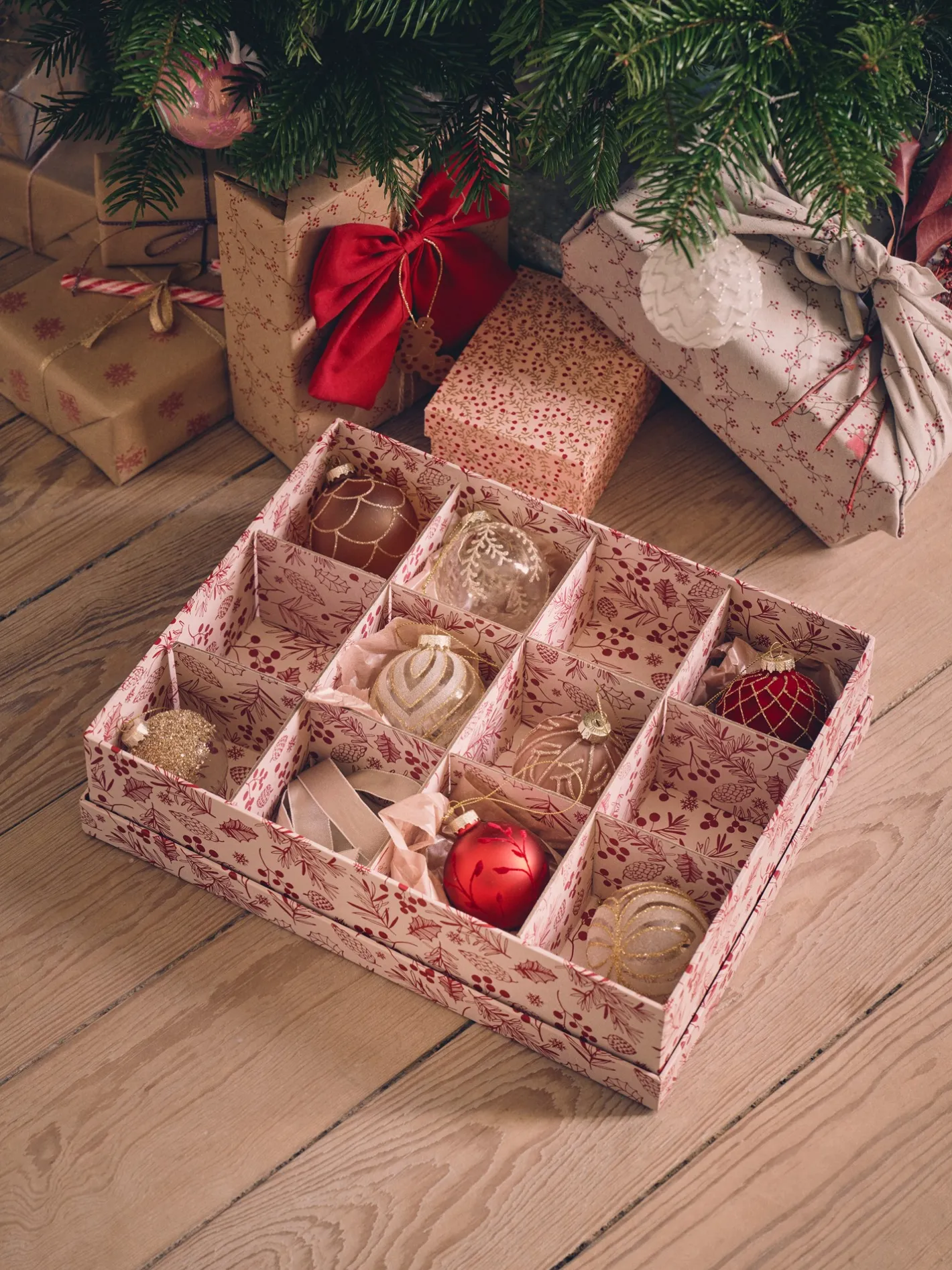 Søstrenes æske er lavet af 100% FSC®-certificeret papir. Den måler 38 x 30 x 9 cm. “De kan bruge den til opbevaring af Deres julekugler og andet pynt,” foreslår Clara.