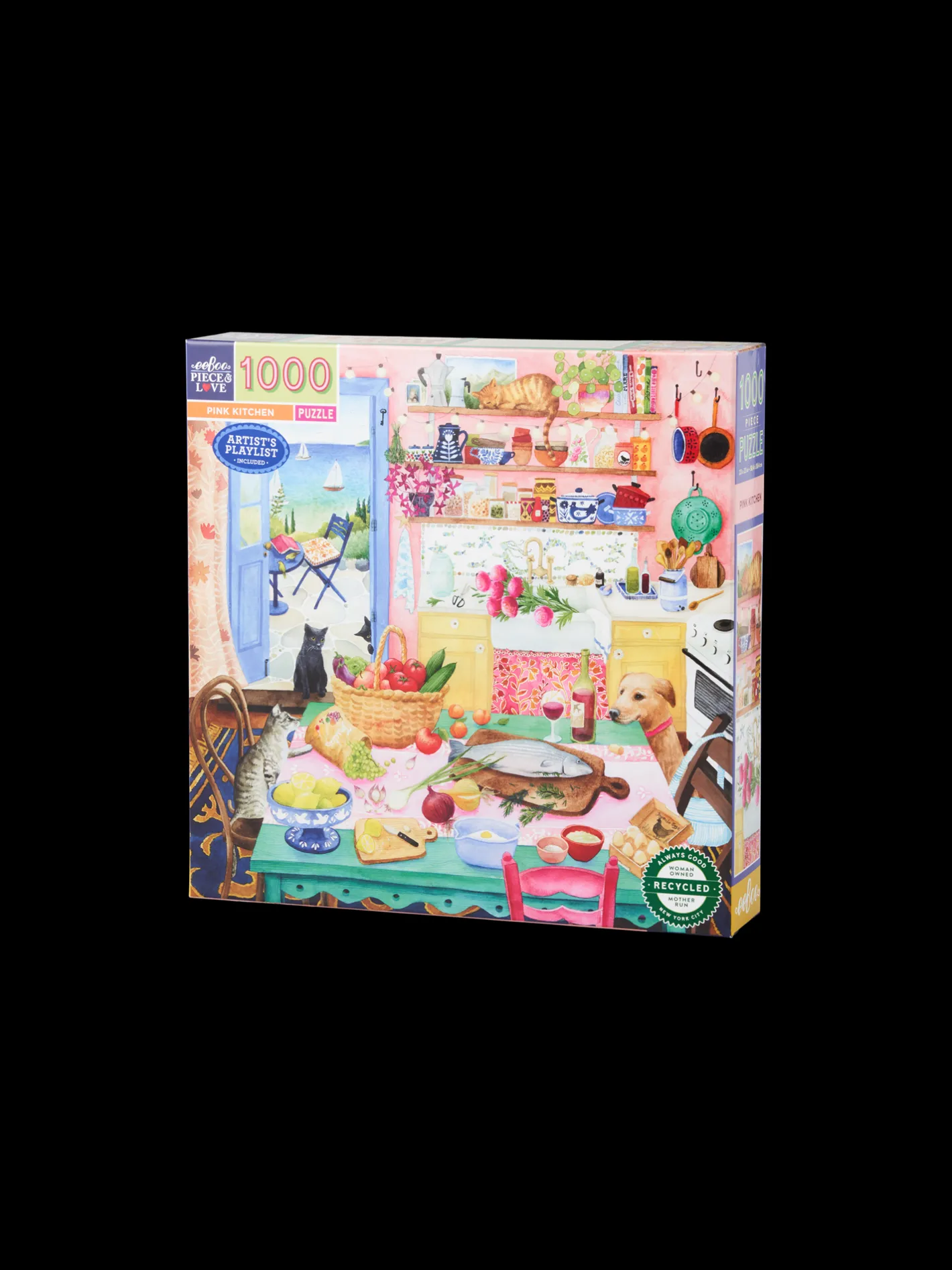 Pink Kitchen-puslespillet fra eeBoo er lavet af papir og måler 58,4 x 58,4 cm, når det er samlet. Puslespillet har 1000 brikker. Illustrationen er lavet af Maria Over.
