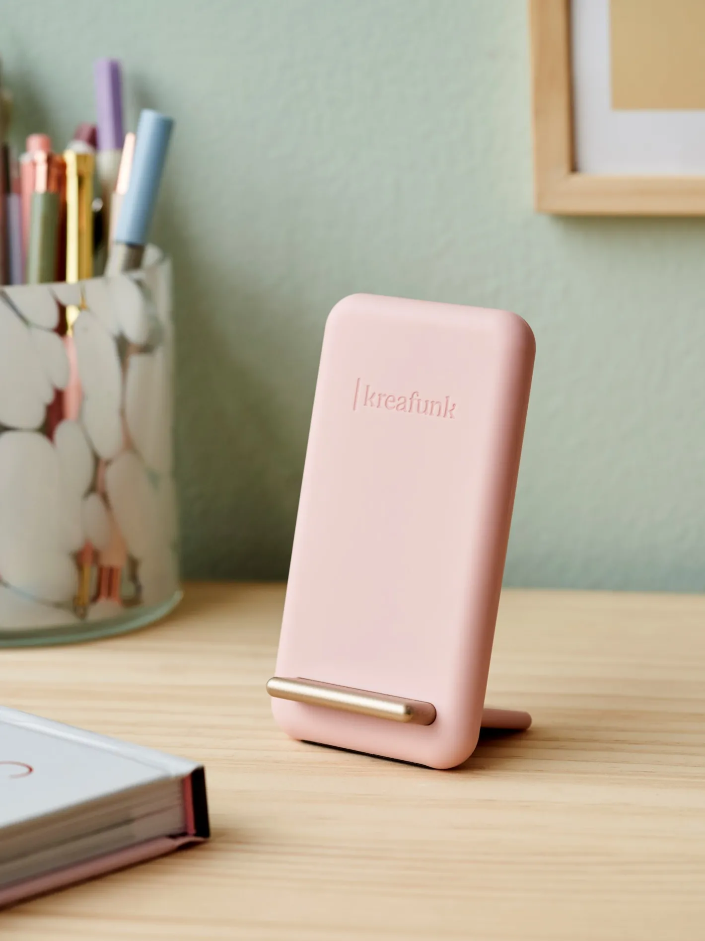 Søstrene gør Dem venligst opmærksom på, at denne vare kun forhandles online.Det minimalistiske udseende af den trådløse reCHARGE oplader fra Kreafunk gør, at opladeren passer perfekt på Deres natbord eller skrivebord uanset Deres foretrukne æstetik. reCHARGE har en USB-C-forbindelse, og da den er opretstående, er det muligt at oplade Deres telefon både lodret og vandret. Derudover har den et diskret LED-lys, der angiver opladningsstatus.”Praktisk og tiltalende,” smiler Clara.