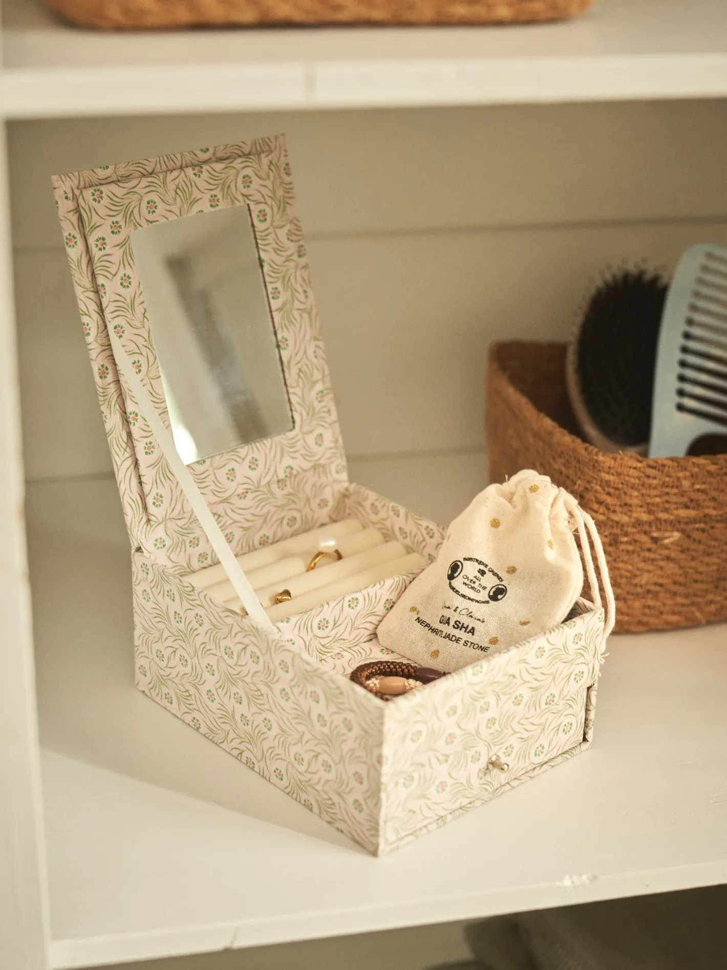 Søstrenes smykkeskrin har en 100% FSC®-certificeret fyrretræsbase beklædt med velour. Låget har et spejl, og der er masser af skuffer til at holde alle Deres skatte sikre.