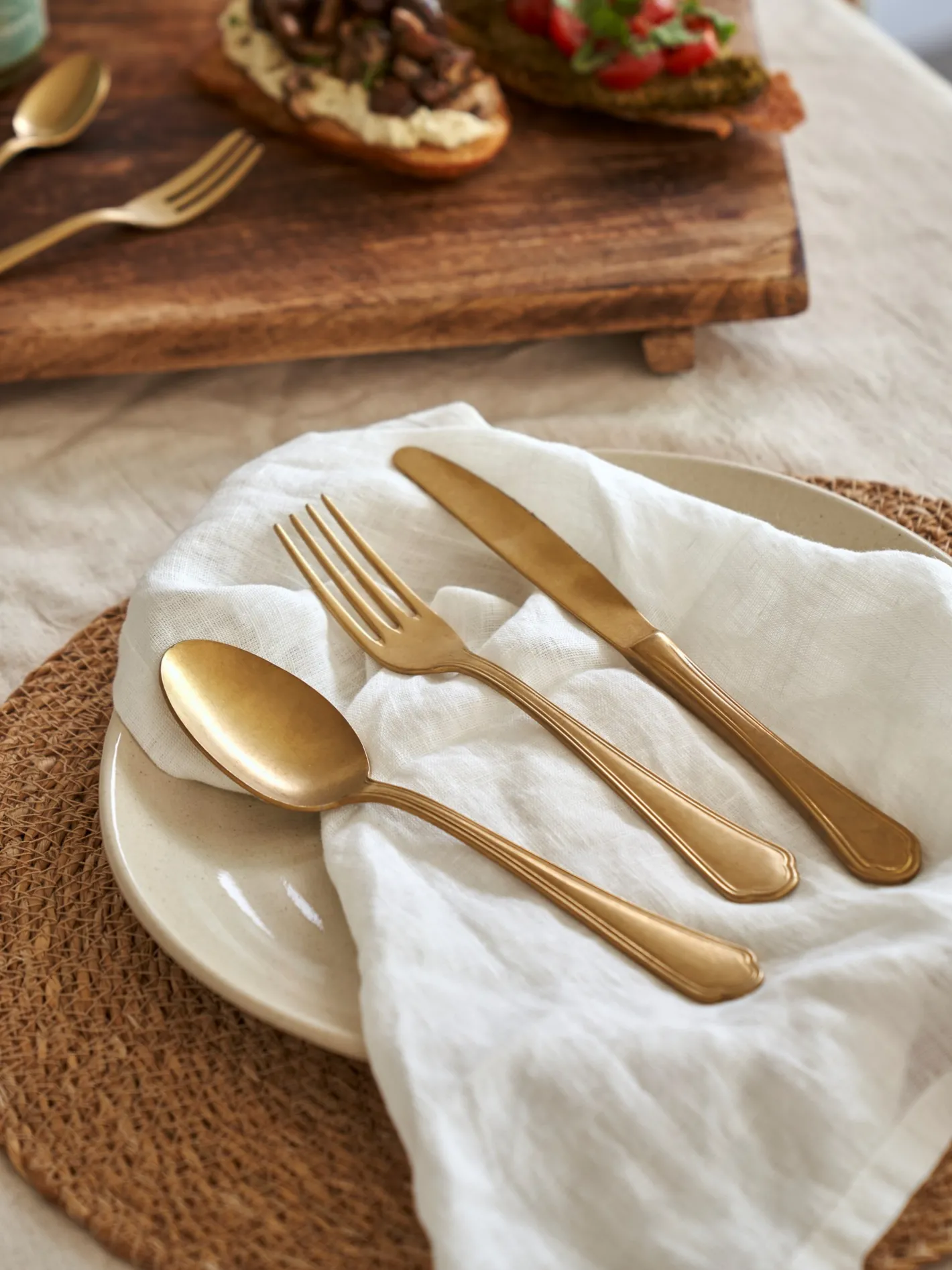 Søstrene gør Dem venligst opmærksom på, at denne vare kun forhandles online.Denne skønne spiseske fra Neva er lavet af rustfrit stål med guldfarvet PVD-belægning. Spiseskeen har en længde på 20,5 cm.Anna og Clara ved, at bestik er et væsentligt element i enhver madoplevelse, idet det rummer både funktionalitet og æstetik. Den rigtige borddækning kan gøre underværker, mener Anna og Clara, og Deres samling af knive, gafler, skeer og meget mere fra det italienske brand Neva har været et vidunderligt fund for søstrene.”Bestik er ikke blot redskaber til at spise med; det er en forlængelse af ens personlige stil,” bemærker Anna, mens hun omhyggeligt dækker bordet til en middag med nære venner. “Hvert stykke bestik udstråler kunstnerisk håndværk,” tilføjer Clara med et smil.Tag Deres næste madoplevelse til nye højder med elegant bestik fra Neva.