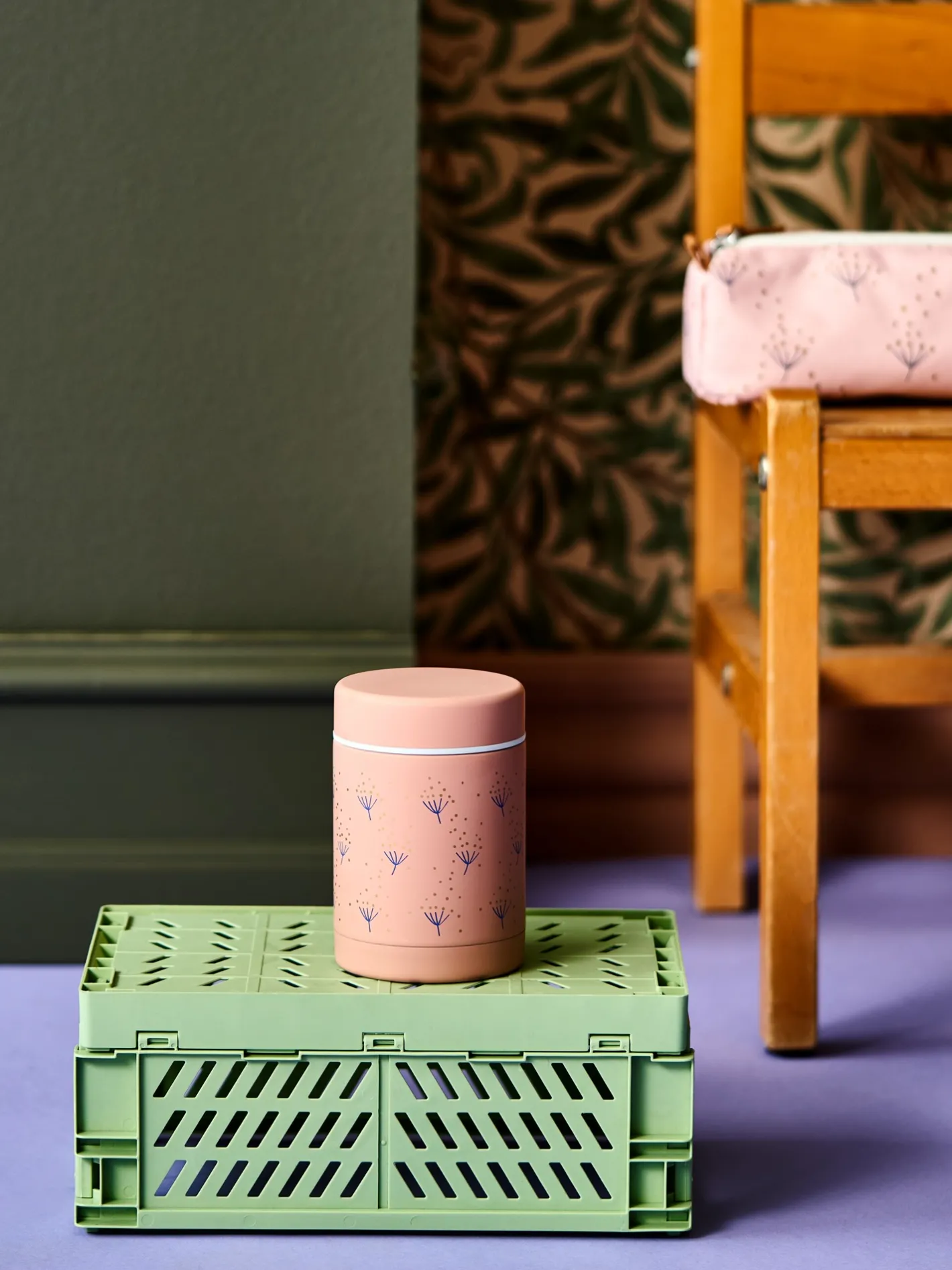 Denne madkasse fra Fresk er dobbeltvægget og lavet af rustfrit stål. Den måler 8 cm i diameter og 12 cm i højden og kan indeholde op til 300 ml.”Den perfekte ledsager til Deres gåture eller dagsture,” siger Anna med et smil. “Og det yndige motiv passer godt sammen med andre Fresk-produkter,” bemærker Clara begejstret. Anna og Clara bemærker venligst, at dette produkt, når det håndteres korrekt, kan holde indholdet varmt i op til 6 timer og koldt i op til 8 timer.