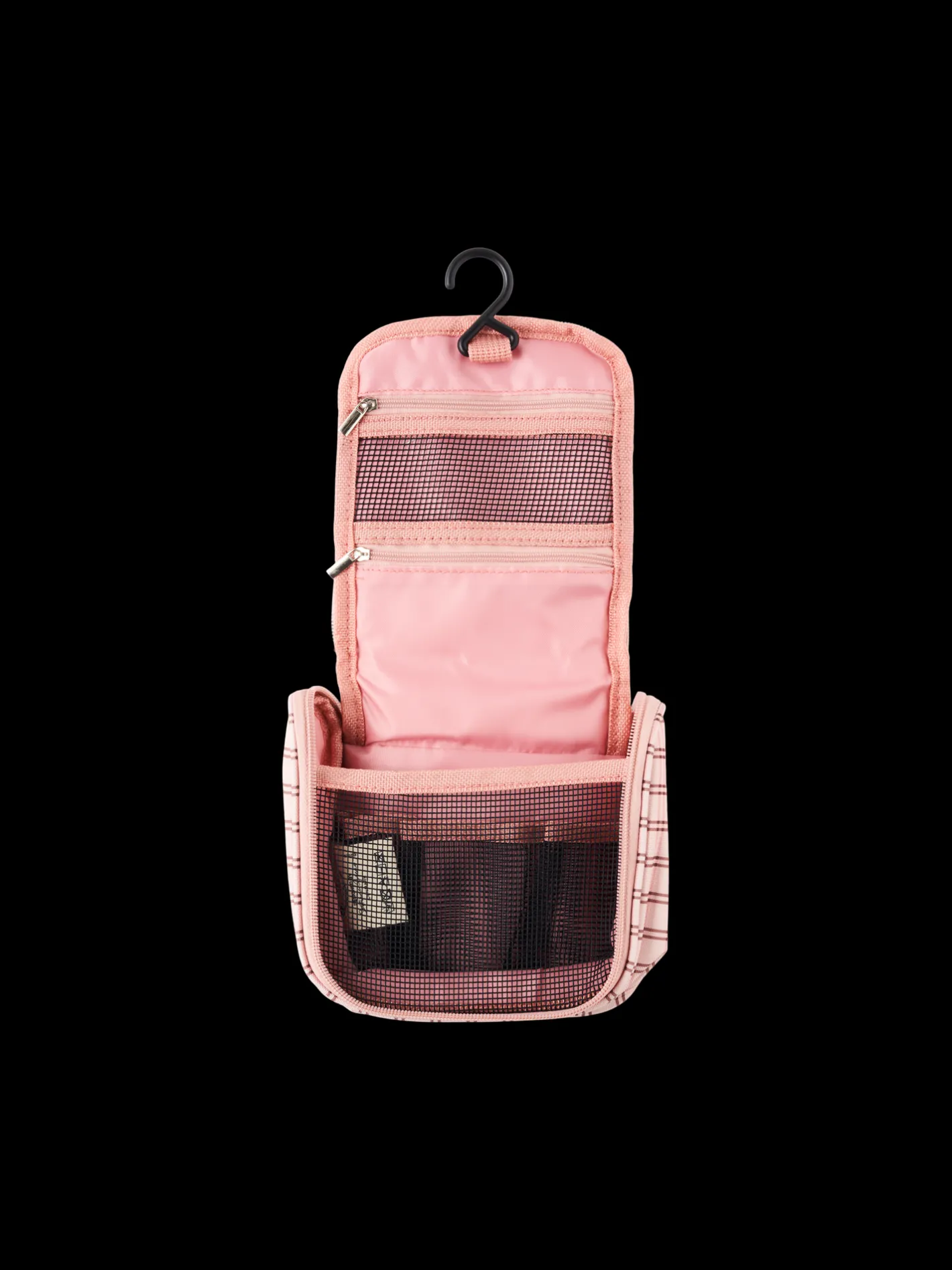 Søstrenes toilettaske er lavet af polyester og har nylonkomponenter. Den har en lille løkke øverst til ophængning, og når den foldes ud, måler den 33 cm.