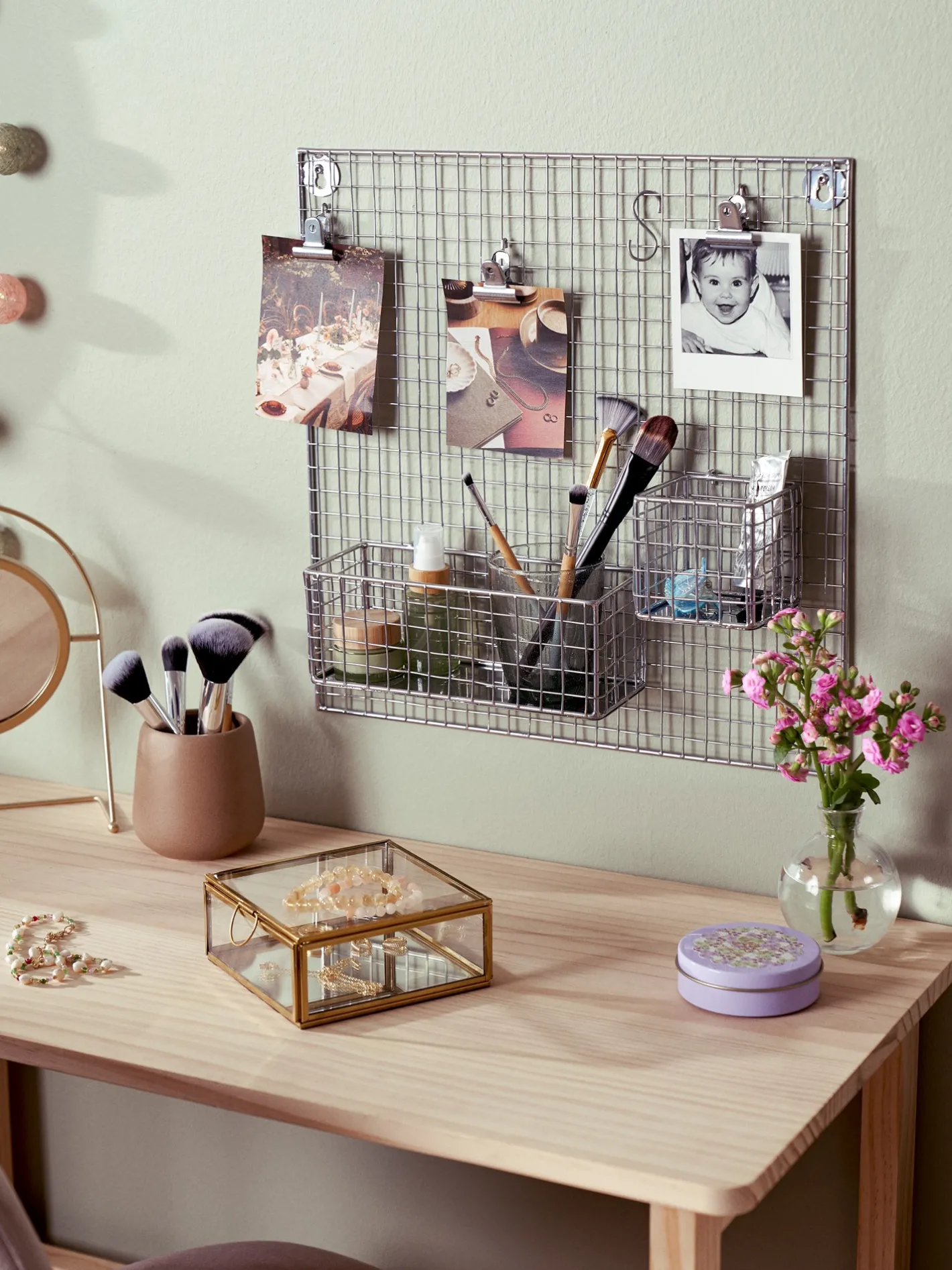Søstrenes trådhylde er lavet af jern og måler 38 x 38 cm. Den indeholder 3 klemmer, 2 kroge og 2 hylder. Indret Deres hjem, og nå nye højder med søstrenes trådhylde.