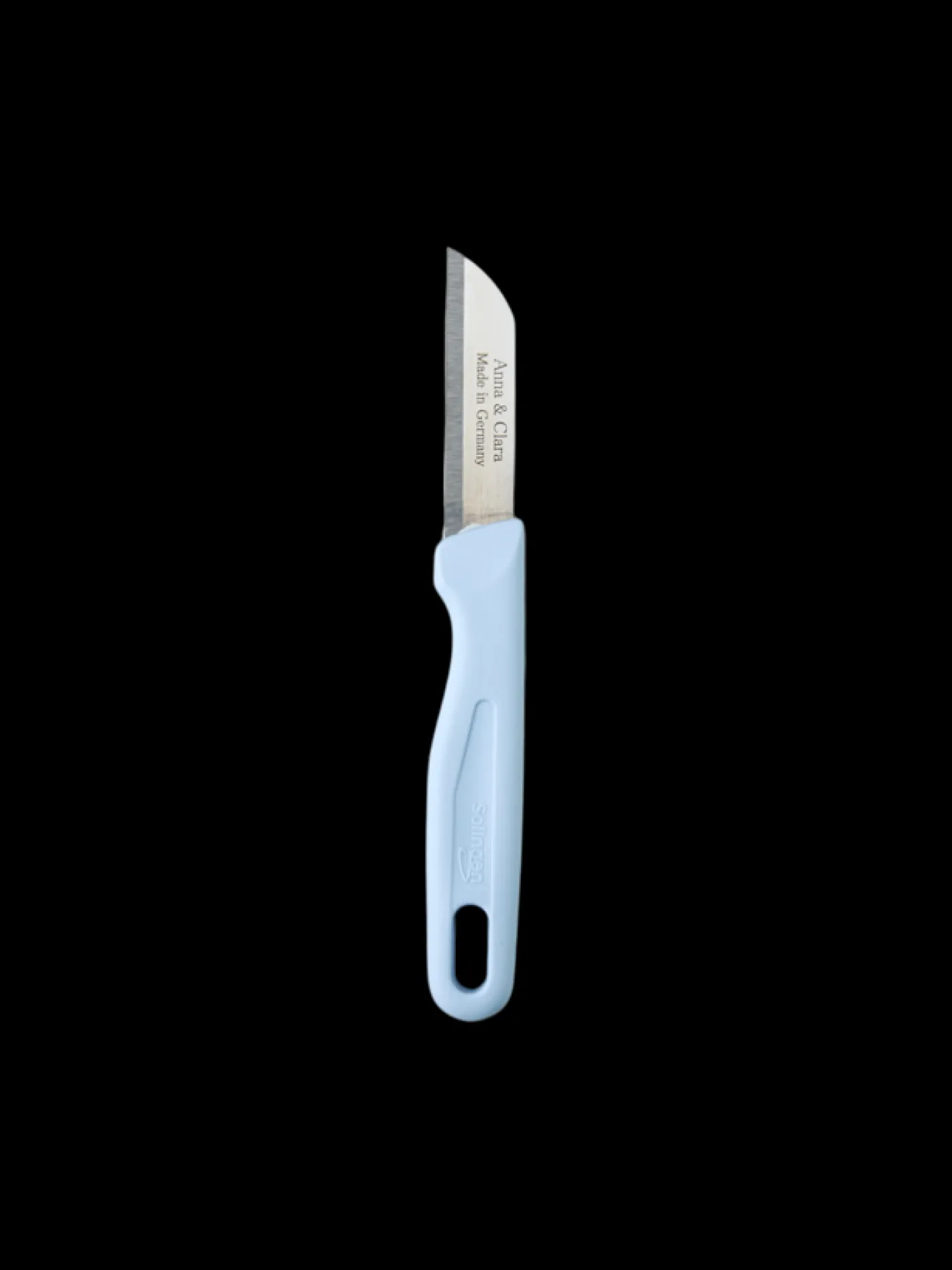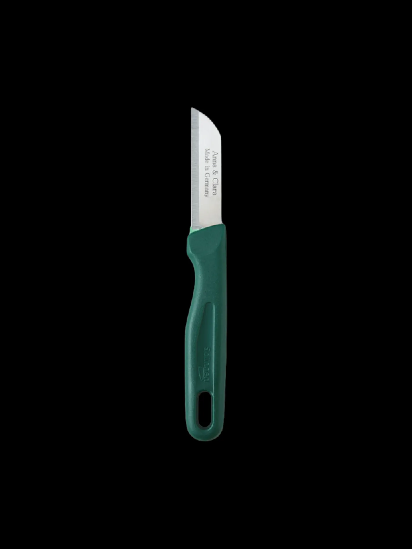 Anna og Claras urtekniv måler 16 cm i længden og 2 cm i bredden. Den er lavet i Tyskland af plast og rustfrit stål.